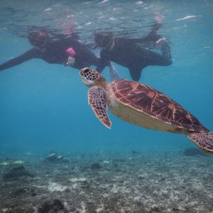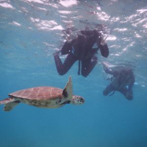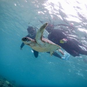 なんと着いた日から雨、雨(泣)綺麗な海の写真も撮れずにテンション下がり気味でしたが、このツアーは雨でも関係無く楽しめました。ウミガメにもちゃんと会えて、しかもずっと藻を食べ続けている食いしん坊の亀さんだったので、撮影する時間たっぷりで、大満足でした。インストラクターさんは、ウミガメが呼吸するタイミングを狙い写真を一緒に撮ってくれ、良い記念になりました。また、マリンスポーツも凄いスリルがあり楽しかったです。もしも天気予報がよく無くても、こちらのツアーはとてもおすすめです!