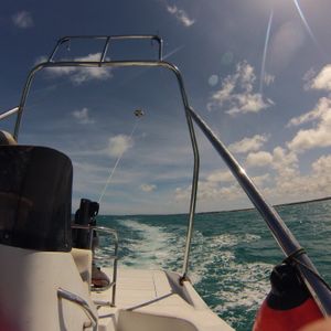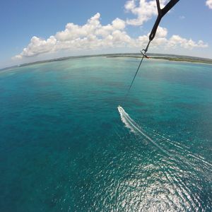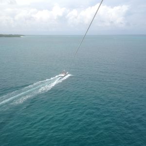 上空はさぞ風切り音がするのだろうなと思ってましたが、ロープが伸びきるとボートの音が遠ざかり風の音も無い静寂な世界で足元には360度海が広がっていました。
