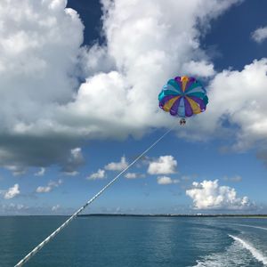 聞くと200mのロープの長さで70〜90mの高さまで上がるとのこと。実際乗ると相当な高さに!宮古島や周辺の島も一望でき、ウミガメも見えました。また体験してみたいです。