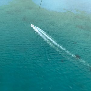 飛ぶ前にウミガメが見える可能性あると言われてたのですが、実際に数匹のウミガメを空中から確認。飛ぶ時間は約15分。もう少し(30分くらい)空中散歩できれば満点ですが、十分楽しめます。写真は必至の覚悟で空中からボートを撮影しました。