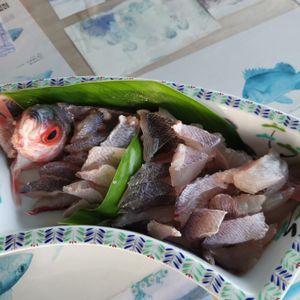 The fish called Gurukun was served as sashimi (raw), boiled and fried.
