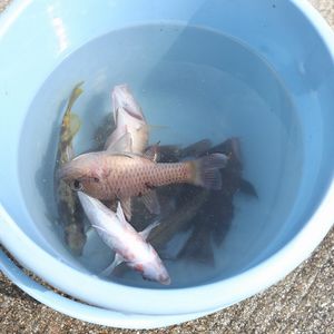 当日は小雨、風も吹いていましたが、子どもたちは釣りに集中!スーさんに教えてもらいながら4匹綺麗な魚を釣りました。釣った魚は図鑑で調べて名前を教えてもらえました。