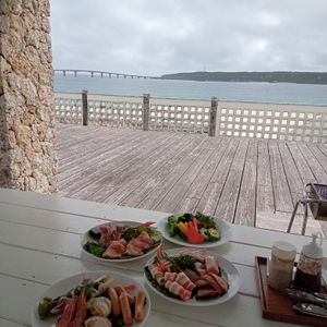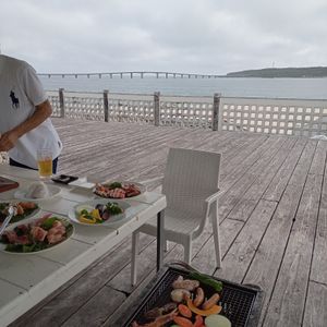 2回のテラスがBBQの場所、海からの心地よい風が吹き抜けるすてきなところです。もちろん景色も最高。この日は平日でちょっと中途半端な時間だったためか私たちだけの貸し切り状態。BBQはお肉と海の幸、たっぷりの量でお腹いっぱいです。食べきれないおにぎりは持ち帰りたいと話すと、焼きそばも残っていたとの事これも夜食用にと調理して持たせてくれました。