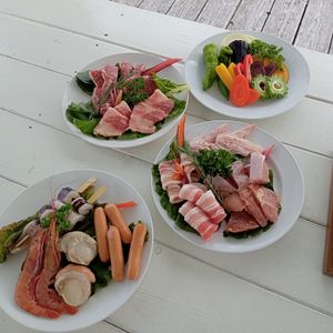 すでに炭に火がついた状態でBBQコンロを持ってきてくださったので、すぐにBBQを始められました。他のグループとのテーブルの距離も十分あり、子連れでも大丈夫でした。食事の量は牛・豚・鶏肉にウインナー、野菜、おにぎり、焼きそば (好きなタイミングで出来立てを持ってきてくださる)と十分でした。