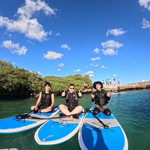 SUP体験では「落ちたらどうしよう…」と不安でしたが、丁寧なレクチャーでみんな無事成功!笑
