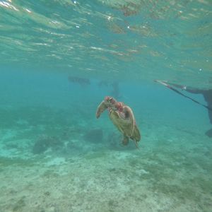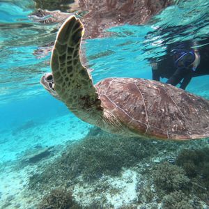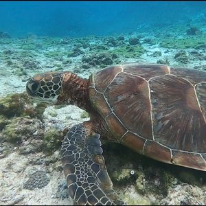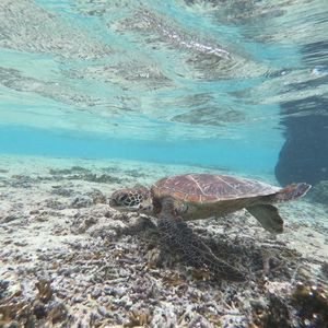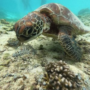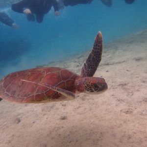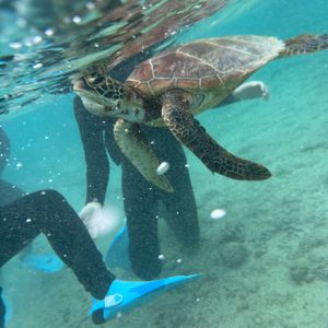 ガイドさんがスポットに案内してくれて、沖縄っぽいカラフルな魚に加え、運良く海亀を3、4匹見れて貴重な体験ができました。海亀は息継ぎをするというのをここで初知り…目がつぶらでとても可愛かったです。