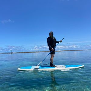 初めてのSUPで不安半分楽しさ半分で挑みました。同意書にサインをして、お姉さんの説明を受けていざSUPに!怖くて最初は座ったまま乗ってましたが、立ってみると意外と乗れました!落ちると足が底につかなかったので注意!しっかりライフジャケットは着てます!マスクは基本的につけてません!日焼けするのでラッシュガードは着てやるのがおすすめです!サンセットを浴びながらのSUPは最高でした!また機会があったらやります!ぜひ皆さんも!!