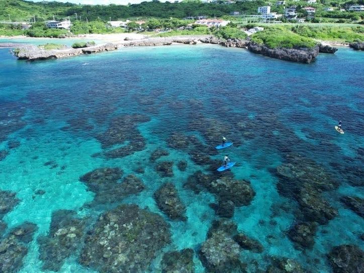 波消しブロックの中の湾で、透き通るような海の上を初めてのSUPを楽しめました。