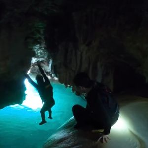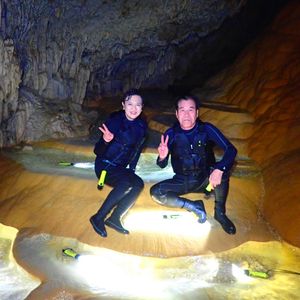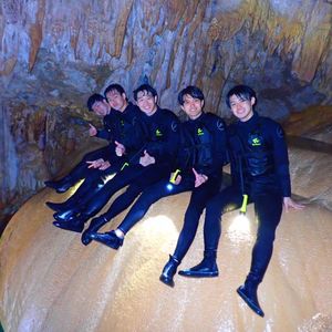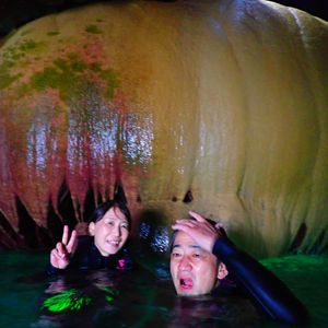 パンプキン鍾乳洞のツアーでは、もう一人ガイドさんが加わり、元気な声でみんなを盛り上げてくれました。鍾乳洞の中は真っ暗でしたが、ライトを点けるとそこは幻想的な世界でした。最後に海に飛び込むときは、少し躊躇してしまいましたが、ガイドさんが「願い事をして飛び込むとその願いが叶うと言われています。」と言うので、願い事をしながら飛び込みました。子連れでの参加も、ガイドさんがしっかりサポートしてくれて、その場を盛り上げてくれました。ツアーでの写真も当日中に送ってくれて、迅速な対応でした。写真もどれもよく撮れていて、満足しています。ありがとうございました!