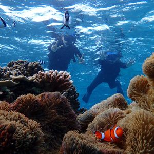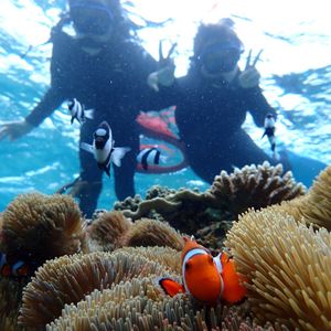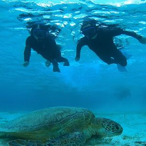 3月中旬に家族四人で参加しました。天候に恵まれ、朝から快晴の中のツアーでした。我が家は子連れ(8歳、4歳)での参加でした。パンプキン鍾乳洞とウミガメのツアーは6歳以上のところが多い中、こちらのツアーでは4歳から参加可能だったのでこちらのツアーに決めました。4歳児にシュノーケルが出来るのか?という不安を抱きながら当日を迎えましたが、当日、ガイドさんがシュノーケルボートを持ってきてくれて、我が家の4歳児はボートにうつぶせになり海の中を覗き込んでいました。ウミガメ二匹とクマノミ、きれいな色の熱帯魚を間近で見ることが出来、充実した時間を過ごしました。