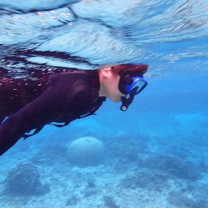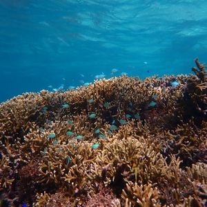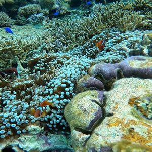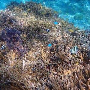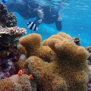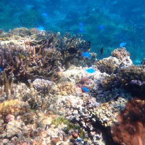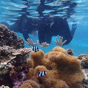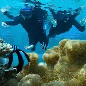 天気は快晴で、上から見だだけでも十分綺麗でしたが、実際潜ってみると鮮やかな魚と珊瑚でいっぱいで更に綺麗でした。シュノーケリングはたまたま貸し切り状態となり、ガイドさんのくまちゃんが楽しく丁寧に教えてくれました!ノリも良くて写真や動画も上手に撮ってくれました!くまちゃん最高☺️また、運良く海亀に2回も会えて、近い距離で見れたことに感動しました。