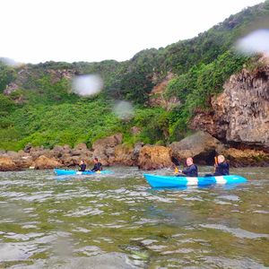 場所を移動して、パンプキン鍾乳洞へ。カヤックに乗って、パンプキンホールへ出発。ウミガメシュノーケルのときと違い、波があり、まさに冒険という感じ。それでも今日は海が穏やかだとガイドさんから聞き、いざパンプキン鍾乳洞へ。パンプキンホールの中に入ると、神秘的な景色が広がっていました。今までいろんな鍾乳洞を見たことがあるけれど、海の中から入る鍾乳洞はまた違った感じでした。4歳の息子は暗闇が怖いと泣いて、主人とガイドさんと一緒にパンプキンホールの前で待っていました。小2の息子と私は、鍾乳洞の中に入り、ガイドさんからいろんな説明を聞いて、写真を撮ってもらい、最後はパンプキンの上からジャンプして、まさに大冒険でした。小2の息子は、「今まで生きてきた中で一番楽しかった!」と言っていました。主人と4歳息子は今回はパンプキン鍾乳洞の探検は出来なかったけれど、息子が暗闇が怖くない年齢になったらまた参加しようと思います。ちなみに4歳息子はシーカヤックは面白かったらしく、転覆しても泣かなかったです。また家族で良い思い出が出来ました!