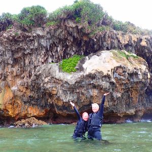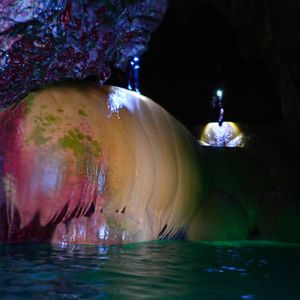 そして、鍾乳洞ではちゃんとお詣りをしてから、ガイドさんに色々説明をしていただきながら、奥へと進みます。鍾乳洞の中でも滝修行や海へのジャンプなど、様々な体験ができます。スゴ〜く楽しい♪