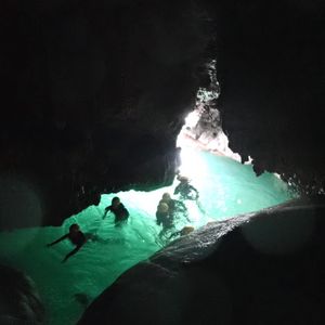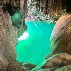 浜辺や海の中を30-40分ほど歩きたどり着きました。それは、とてもとても神秘的な場所で、魅了されました。見て写真撮るだけかと思ったのですが、そこから鍾乳洞を登って、奥に進みます。これが、めっちゃ大変そうにみえました。でもガイドさんが、一生懸命サポートして皆を登らせてくれました。褒め上手w。洞窟奥も神々しく今までになく神秘的でした。世界遺産のトルコのカッパドキアにも似てるようにも思いましたが、歳月が作った自然美は言葉で表すことができないくらい、美しかったです。登った分は、最後に海にダイブして帰りました。これまたとても面白かったです★