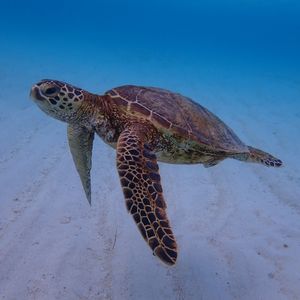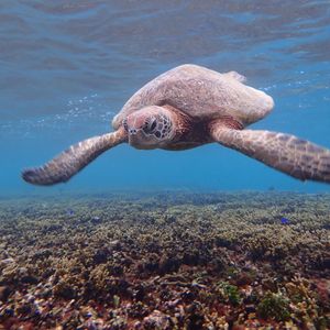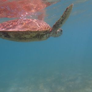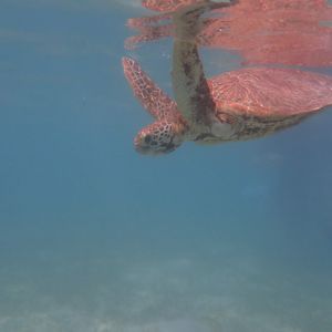 昼食後は、ウミガメを探しにシュノーケリング。運悪く出逢わなかったらどうしようと思いましたが、すぐに1匹目と遭遇。その後も数匹のウミガメを発見し、一緒に泳ぐことができました。