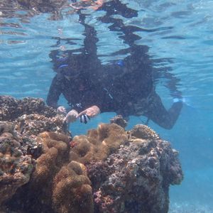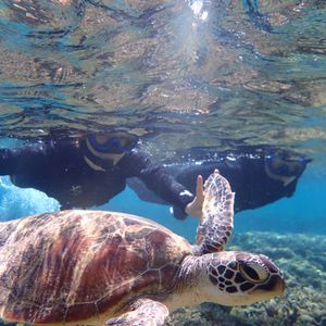 午前中のシュノーケルではウミガメがすぐに見つかり、しかも何匹も会えました!水面に顔を出す瞬間がとにかくかわいかったです。珊瑚やお魚もたくさん見られて最高でした!少し風が強くて波があり泳ぐのが大変でしたが、がんばってよかったです。
