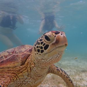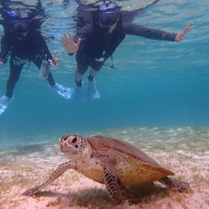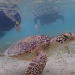 シュノーケリングからスタート。事前に99.9%ウミガメに会えるとの説明を受けました。遠浅で足がつくので、泳ぎに自信がない方でも問題なくシュノーケリングできます。実際ウミガメには恵まれ、大小含め複数の個体に遭遇しましたが、その近さと多さには驚きました。ダイビングのウミガメスポットでもあれ程多くのウミガメには出会えないと思います。その上インストラクターさんに、ゆっくりウミガメとツアー参加者の写真を一人一人撮っていただけます。ウミガメ以外にも、珊瑚や魚の説明もたくさんありました。