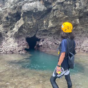 その後、パンプキン鍾乳洞まで自身の車で移動、保良川ビーチからパンプキン鍾乳洞を目指します。移動に際してはインストラクターさんから車内防水カバーを貸していただきました。保良川ビーチ到着後、片道膝下程度の浅瀬を洞窟まで約20分歩きます。足場が悪いことと小さいながらも波の影響を受けるため、特に女性は体力を使うかも知れません。しかし、確実に誰でも歩くことができます。その後、パンプキン鍾乳洞に着いた後の光景は圧巻です。インターネットの写真の期待値を遥かに上回る光景が待っています。日本国内のみならず世界でもあの景色はなかなか見れないのではないでしょうか。洞窟内はアドベンチャー要素があり、軽い滝登り・沢登りや、飛び込みを楽しめます。ここで解散するツアーの場合、水道で足の海水は流せますが、着替えスペース等はないため、帰りの車を濡らさない工夫(大きめのビニール袋や防水シート)があれば尚良いかと思います。