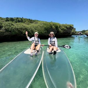 この日、地震の影響でツアーが催行されるか心配でしたが、奇跡的に15時のツアーのみ催行されました。初体験のクリアSUPでしたが、インストラクターの方の懇切丁寧な指導のおかげで、何とかボードの上で立って、パドルで漕ぐことができました。自由時間には、インストラクターの方のご好意で、クリアカヤック体験もさせていただきました。青い珊瑚礁や多くの魚も見せていただくことができました。そして、最後には多くの写真とドローンで撮影された画像も入れて、一本の素敵なビデオをプレゼントしていただきました。宮古島で、最高の思い出ができました。