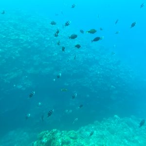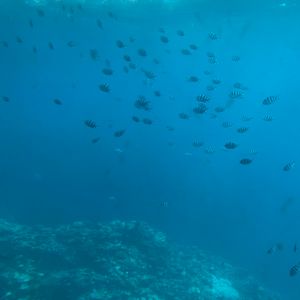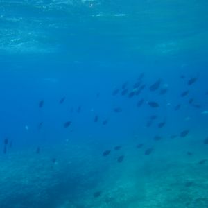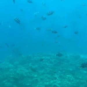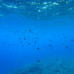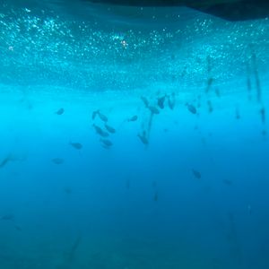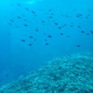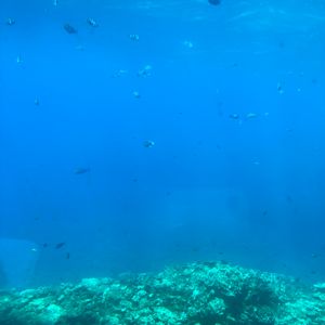 船底から見る海の中は穏やかな青い色で、珊瑚礁のお魚たちが餌をめがけ泳ぐ姿は感動でした。