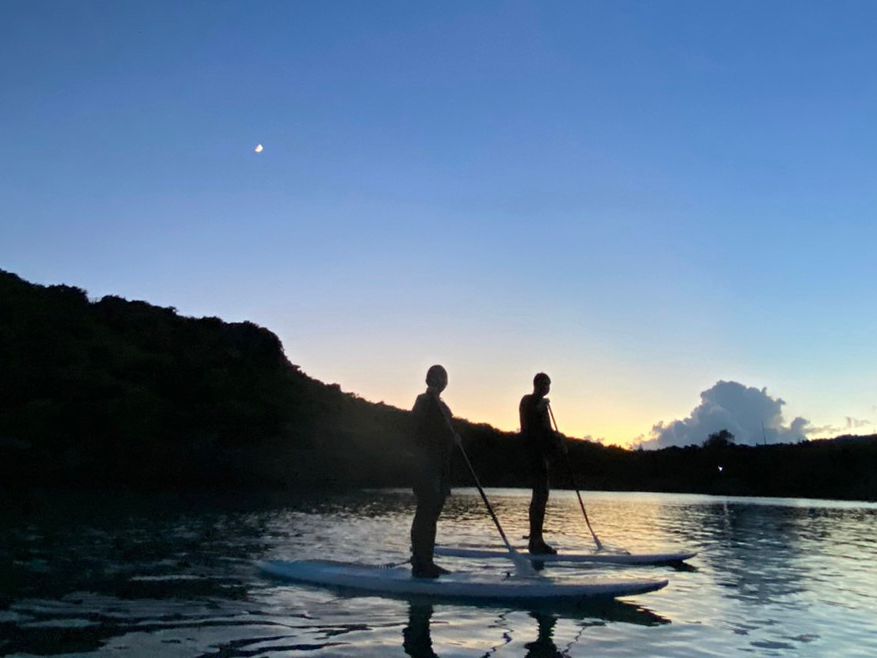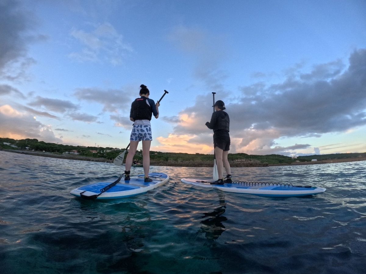 17時半集合で、最初雨の心配もありましたが無事湾で行うことができました。波も荒くなく、夕暮れと共にSUPする経験ができてよかったです。
