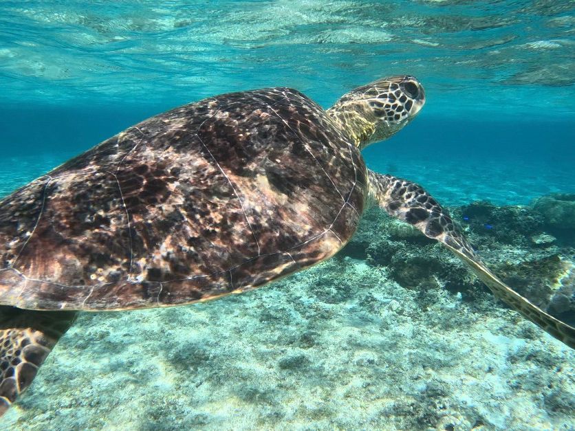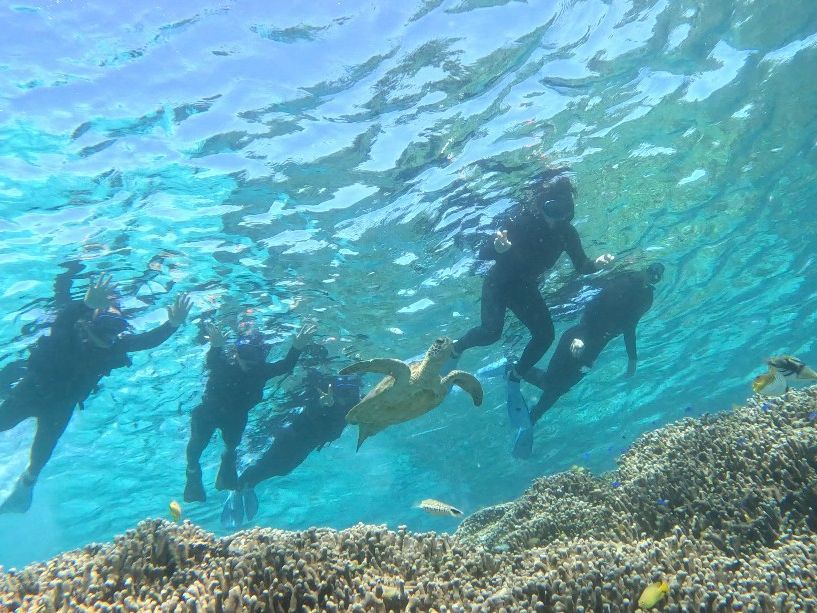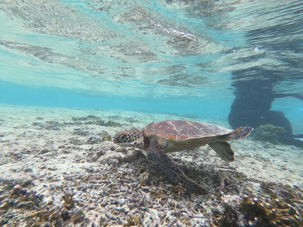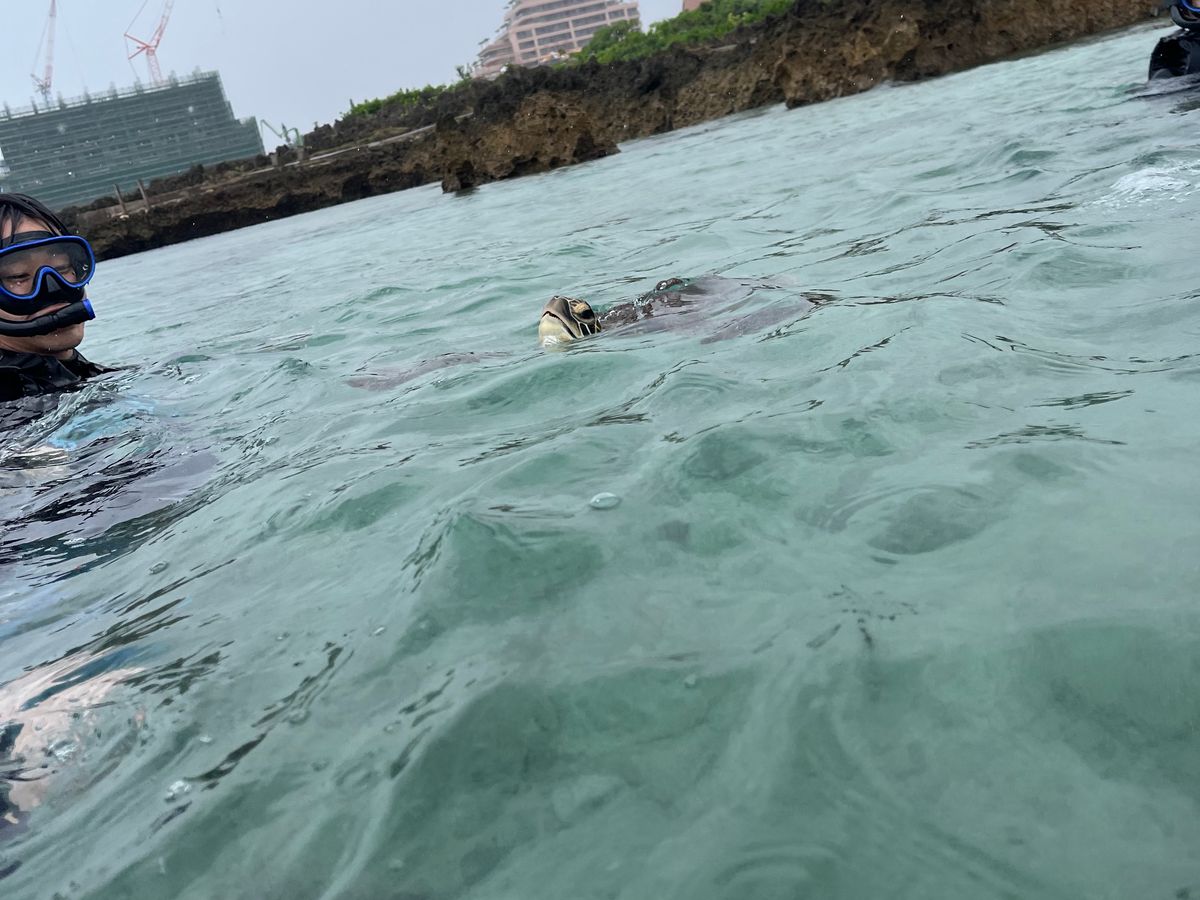 ガイドさんがスポットに案内してくれて、沖縄っぽいカラフルな魚に加え、運良く海亀を3、4匹見れて貴重な体験ができました。海亀は息継ぎをするというのをここで初知り…目がつぶらでとても可愛かったです。