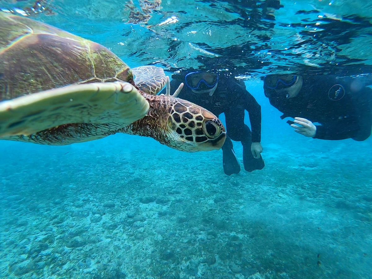 曇り空から晴れ間も見え始め、運のいいことにすぐにウミガメにもすぐに出会え、透明度が抜群に良く、とても素敵な体験が出来ました。シュノーケリング初めての同行者にも優しく教えて頂き、一緒に楽しむことができました。