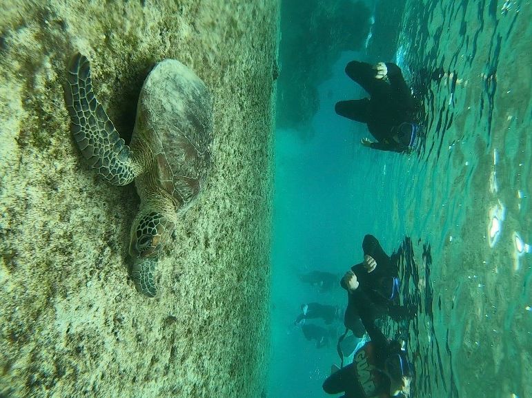 昼からは移動してシュノーケリングを体験させていただきました。運よければウミガメ見れると言うことで、期待していましたが、全然入る気配がなく諦めかけていた。終了間際にまさかの3匹!忘れられない体験になりました。次回も必ず参加希望です。スタッフの方も素敵な方ばかりでした。このたびはありがとうございました。