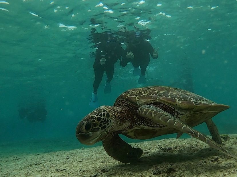 前日に送られてきた待ち合わせ場所には、すごく早く着いてしまってたんですが、ツアーガイドのユーヤさんはもう着いてまっててくれていました。最初から、すごく笑顔が可愛くて、喋りやすいとてもいい印象でした。「海亀みれる確率は30%くらいなんですよー、と言いながら海に入ってものの数秒で下を指差し、海亀です!いましたー!って…笑笑30%はどこにいったのやら、そのあとも同じかもしれませんがまた海亀に会うことができ、息継ぎも見ることができ、海亀に出会う難しさを感じることはなかったです。