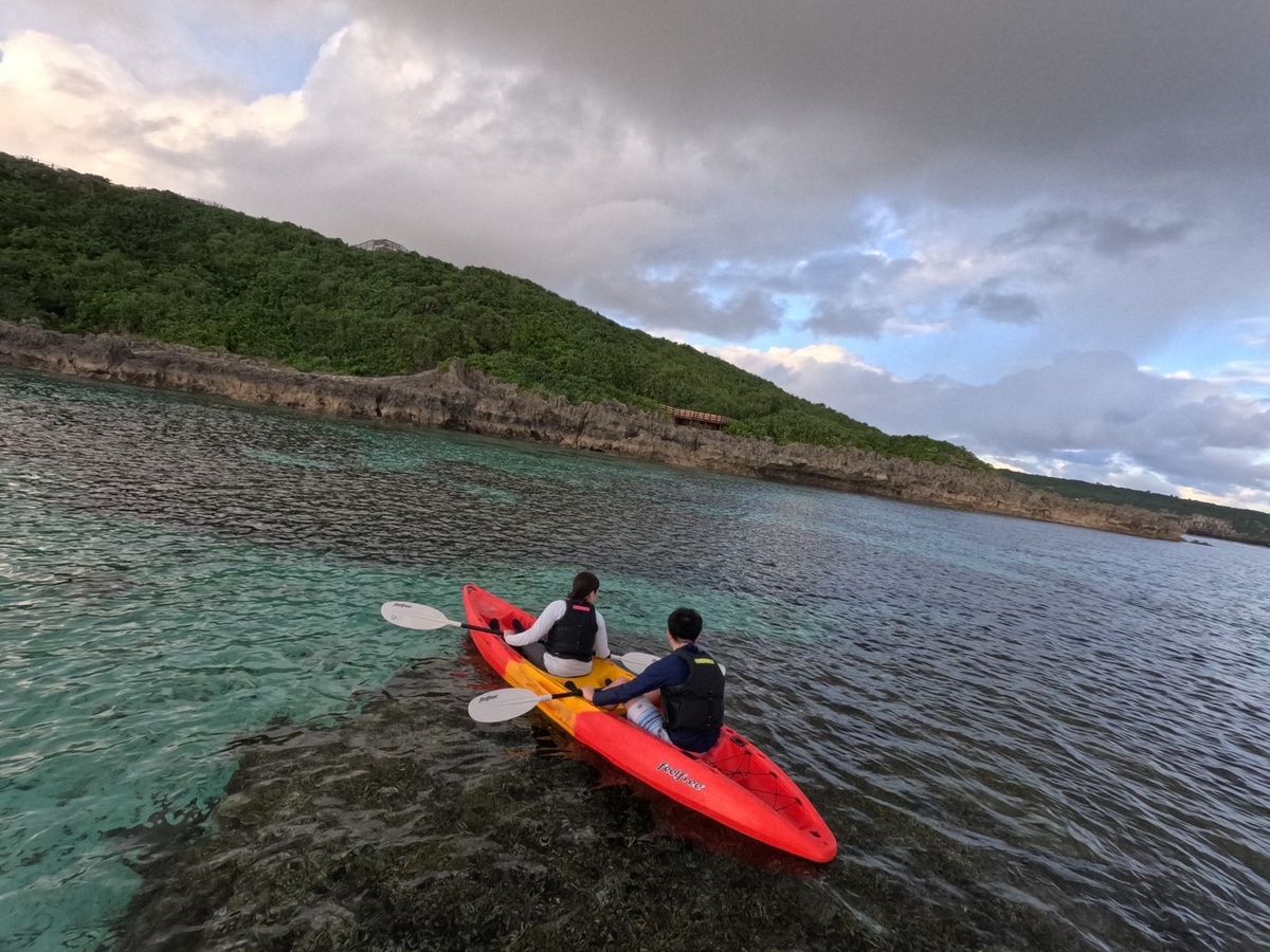 曇りでサンセットは見れませんでしたが、波のない穏やかな海上のカヌー探索は最高でした。