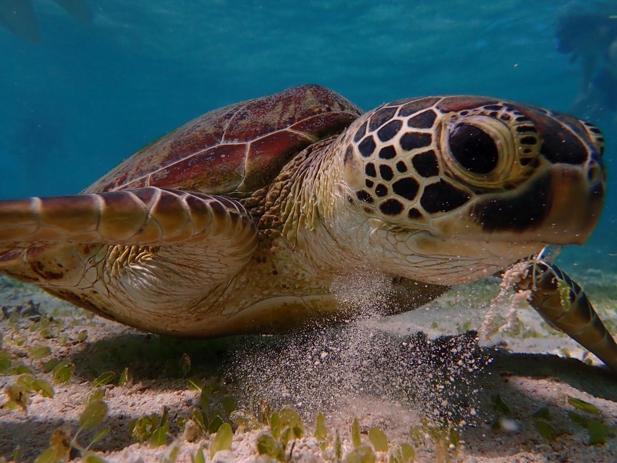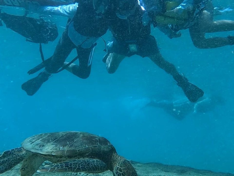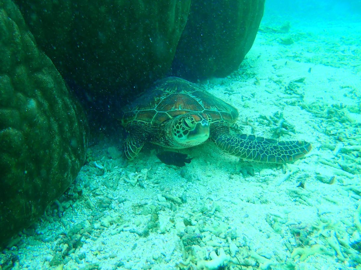 海亀シュノーケルとパンプキン鍾乳洞ツアーに参加しました。海の中に入ってすぐに海亀に会えて、全部で4匹も見られました。インストラクターのお姉さんいわくラッキーだとのこと。海藻を食べている様子が可愛かったです。一緒に写真も撮れて最高でした!