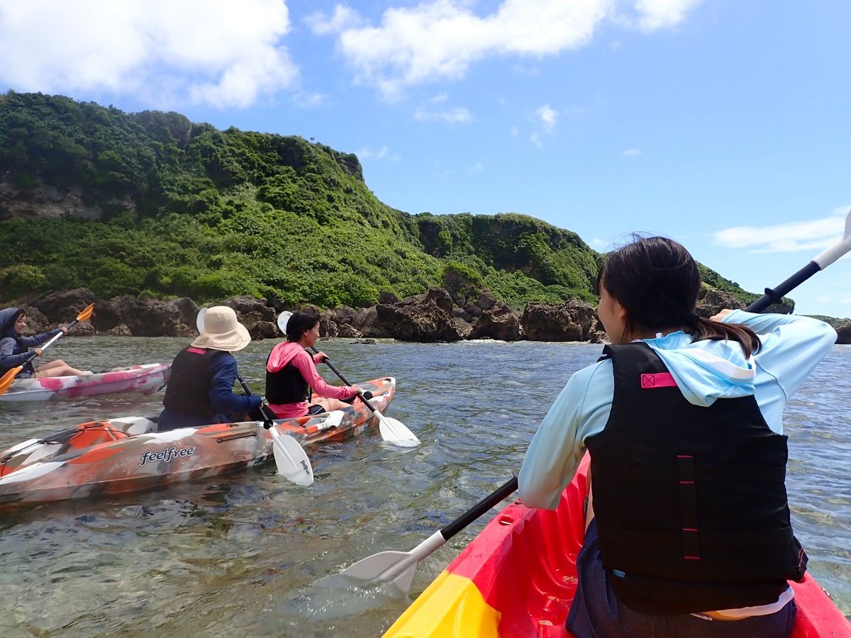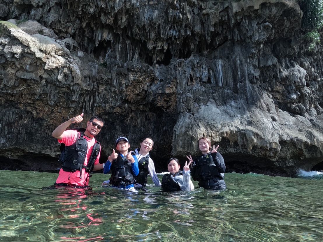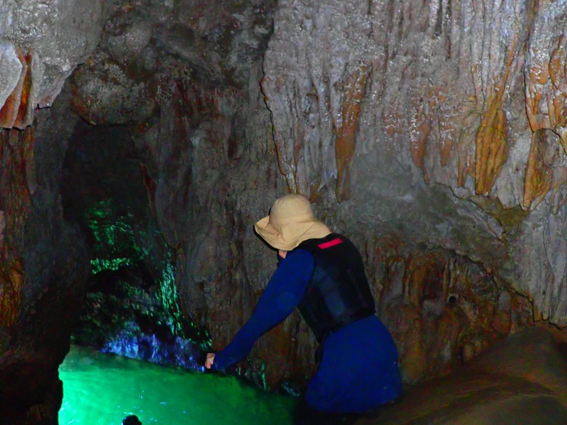 期待以上の体験が出来てとても満足しています。駐車場でマリンシューズやライフジャケットを貸していただき説明を受けてから徒歩でカヤック乗り場へ。4組の少人数なので丁寧に一組ずつ写真撮影をしていただきました。スタッフのゆうとさんはどのグループにも満遍なく声をかけて冗談をまじえながら緊張をほぐして下さる楽しい方で、お陰でグループ同士でも会話が生まれるなど和やかな雰囲気でツアーを体験できました。カヤックの漕ぎ方などのレクチャーの後10分ほど漕いで鍾乳洞入口へ。鍾乳洞の中は水が冷たく神秘的な空間でした。最後飛び込むのが怖くて低い場所からにしてもらいましたが、ひとりひとり無理なく参加できるのもいいなと思いました。頭上の鍾乳石がやや鋭利な箇所もあったり、足元は手持ちライトがあっても暗いので滑ったり切ったりと怪我をしてしまうこともあるかもしれず、なるべく露出が少ないウェアにした方がいいかもしれません。基本的にはそこまでハードではないですが、ご年配の方や足腰に不安がある方は事前にご相談された方が安心かなと思いました。