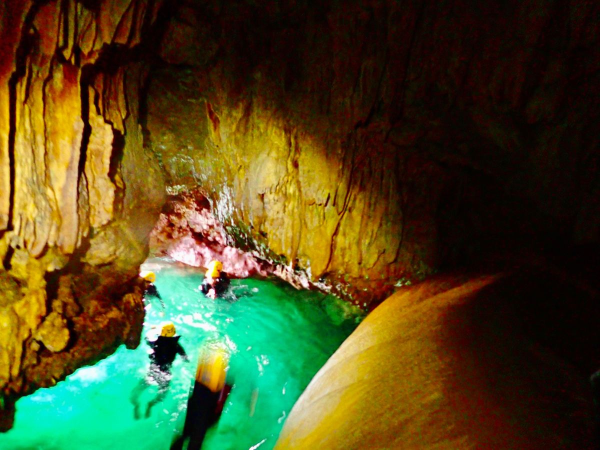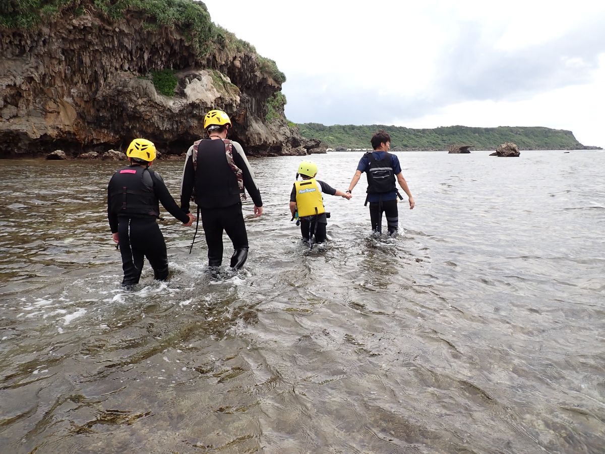 所要時間は、だいたい2時間。潮次第でのスタートって感じでした。自分達のガイドを担当してくださった、小林さんありがとうございました。自分達と別家族(父、兄、弟(小1))のグループでした。インストラクターさんが、下の弟君の面倒を見てあげていて、とても優しい方でした。元気な男の子とかだとこのツアー楽しめると思います。ブーツ、ウェット、ライトを貸し出してくれました。探検みたいな感じでとても楽しめ、また、泥パックもおすすめです。よじ登ったら、ジャンプしたり、アクティビティーな方にぜひかと思います。