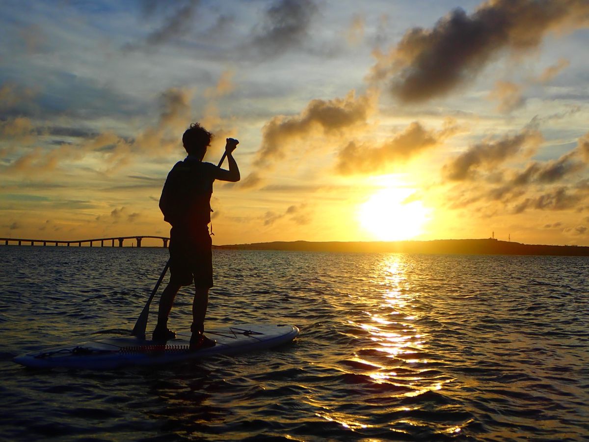 夫婦で参加しました。初めての海でのSUPでしたが大満足でした!SUPに不安がある人でも安心して参加できると思います。わたしは基本的に座った状態でゆったりしてました。落ちる心配がないし疲れません◎撮影時だけ立って素敵な写真を撮ってもらいました。サンセットSUPということで夕方にするので暑くないし、日焼けもしないので楽でした。体力が心配でも大丈夫です。この日は完全な晴れではなく雲がありましたが、とても綺麗な夕焼けが見れて良かったです!宮古島に来た時はまた参加します(^^♪