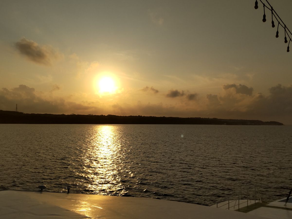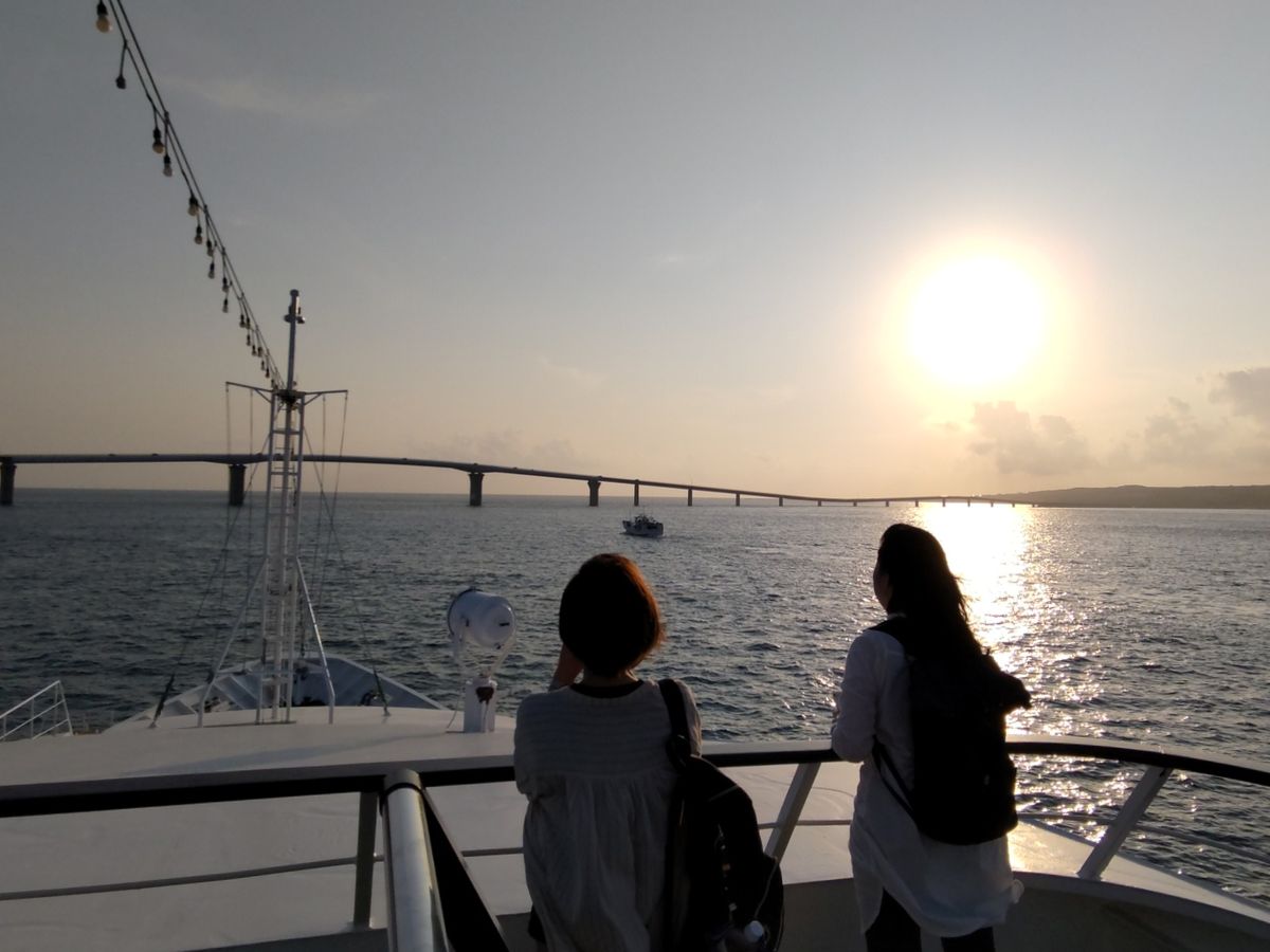 午後到着でも参加できる夕方からのコースがあり、乗り場もホテルから近かったので参加してみました。伊良部大橋の方から湾内をゆっくり回り、綺麗な夕日を眺めることができました。食事なしだと2時間は少し長く感じましたが、宮古島ではあまり船に乗る機会がないので面白い経験でした。