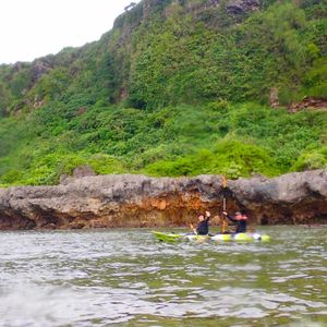 カヌー上手く漕げているかは分からないけれど誰にでも簡単に出来て楽しかったです。透き通った海を見ながら洞窟の方に向かい、少し離れた所から腰に浸かるぐらいの海辺に降りて鍾乳洞の方に向かいました。ガイドのお兄さんに一つ一つ丁寧に説明して貰い色んなばしでグループ事に写真をたくさん撮ってもらいました。パンプキン鍾乳洞から海に飛びこぶ体験もさせて頂きました。とても開放感があり小さな男の子も挑戦していてとても楽しかったです!