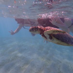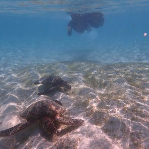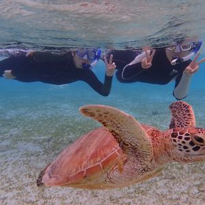 シュノーケリングは海ガメの近くで泳ぐことが出来、インストラクターさんが沢山写真を撮ってくださいます。(約60枚ほどでした!)その後海ガメと各々泳ぐ時間もあるので、撮ってくださってる時は思う存分ポーズを決めてください。事前に来るLINEの注意事項の通り、参加者同士がくっついていると素敵な写真が撮れました。