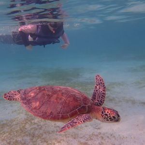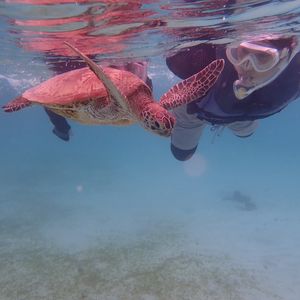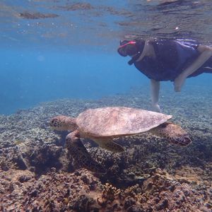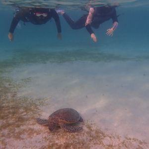 ウミガメシュノーケルでは、ウミガメのいるポイントまで案内していただき1組ずつ撮影、そして珊瑚礁などを回って陸に戻るという流れでした。泳ぎに慣れない人は引率者に浮き輪で引っ張ってもらう等配慮もしていただけます。また、撮影の待ち時間等は離れすぎない範囲で自由行動だったので、持ち込んだ水中カメラでウミガメやツーショットを撮ったりして楽しんでいました。