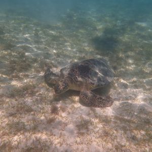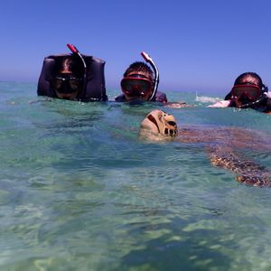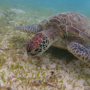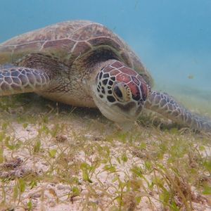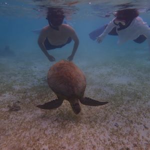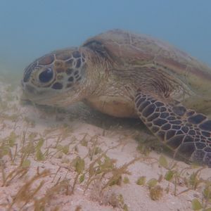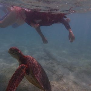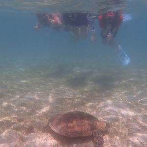 コロナ感染拡大により、観光客が減りインストラクターが私たち一家族を率いることになり、のんびりとウミガメを鑑賞することができました。感染予防をしながら準備を進めつつ、ウミガメが、泳いでいるところをいろんな角度で近くから見ることができました。私たちがウミガメの上を通ろうと前を泳ごうと、全く気にする気配もなく、海藻をマイペースに食べていました。時々、水面から顔を出し息継ぎをしているところも間近にみることができ貴重な体験ができたと思います。そして、さまざまな大きさのウミガメを見ることもでき、まるで家族のようでした。後から聞いた話ですが、ウミガメは皆乗用車のタイヤより一回り大きいサイズでしたが年齢はたったの20〜30歳前後とのことです。それを聞いた時は驚きました。最後に、貴重な体験をさせて戴きありがとうございました。皆様もぜひウミガメと泳いでみては如何でしょうか?