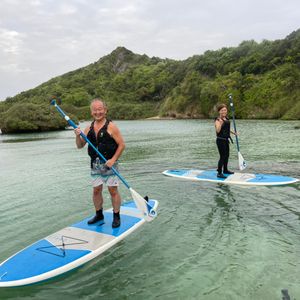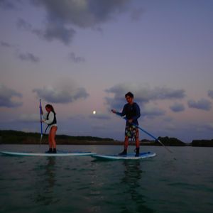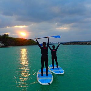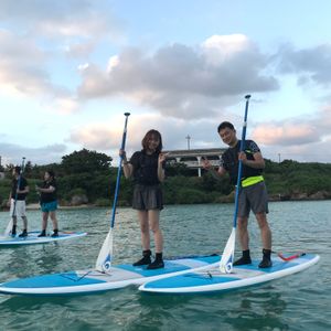 大学生の娘と急に思い立っての旅行。天気も不安定な時期なので前日にこのプランを予約しました。運良ければ濡れないし、日焼けもしないで沖縄を感じれることでセレクト。天候も程よくのんびりとスタート。初心者でも楽しくやれました。栃木県出身の若いインストラクターさんがとても丁寧に対応してくださったので、安心して楽しめました。少し雲がかかっていたのでイメージ程の真っ赤な夕日とはなりませんでしてが、綺麗な写真も撮って頂きました。波がなければ、海に出ることもあるそうなので次回は経験したいです。無事に濡れずに終わりましたが、仲間や家族と一緒ならば落ちた方が盛り上がるかもしれませんね(笑)