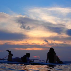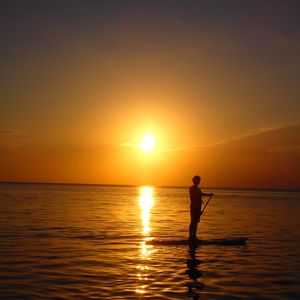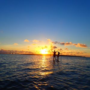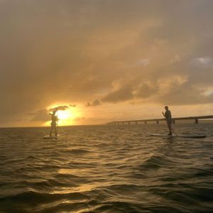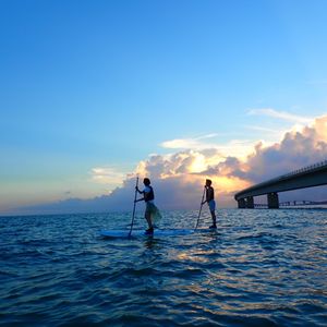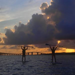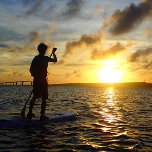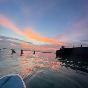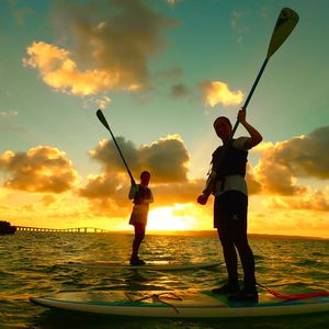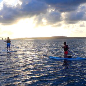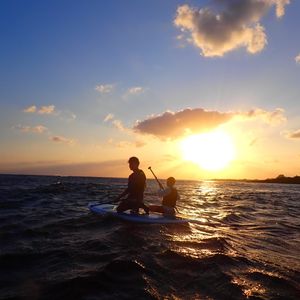 曇り予報で正直サンセットは諦めていましたが、奇跡的に雲の隙間から夕陽が見えた時はとても感動しましたね!SUPも上達がはやく、お上手でした!そして2人乗りもお見事でした