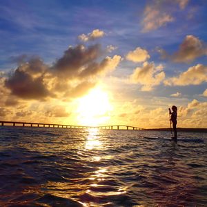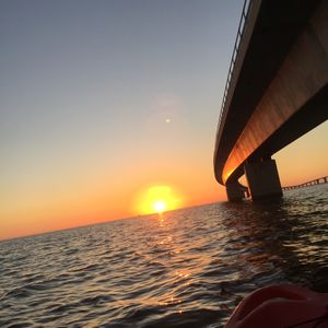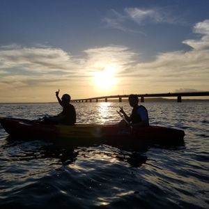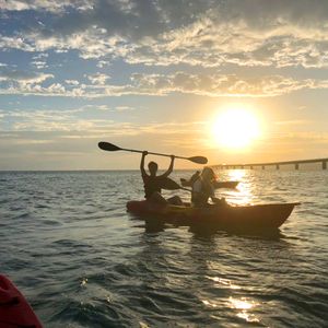 私は娘と2人でサンセットカヤックに参加しました。カヤックに乗るのははじめてで、泳げない私はとても不安でした。でも、スタッフの方が丁寧に説明してくれて、2人同行してくれたので、安心して行く事が出来ました。夕日の写真を「撮りましょうか?」と声をかけて下さって、私のスマホで撮影してくれました。伊良部大橋と夕日が一枚の写真に収まり、2人の記念写真が撮れました。橋の下からみえる光景はとても素晴らしいものでした。機会があれば、また参加したいです。