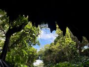 ケーブルカフェを楽しみたかったので、少し早めに到着。 洞窟がイメージより大きくて素敵でした。 しばし写真を撮ったりして楽しんだ後、ガイドの説明へ。 トトロの傘のようなクワズイモの葉やガジュマルの木の中、時代を遡り 港人の居た世界へタイムスリップしたような気分に浸りました。 長い年月の間に川の流れで斜めになった鍾乳石、一滴の雫が降り積もってできた気の遠くなる時間が目に見えて、石棺の跡などリアルで、こ