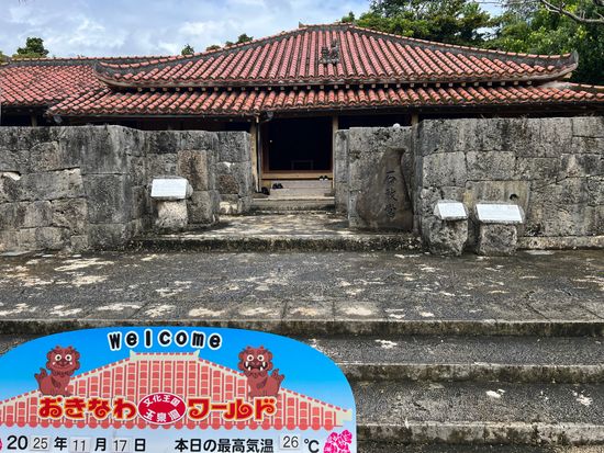 【園比屋武御嶽】琉球石灰岩で造られた建造物で、国王が外出するときに安全祈願をした礼拝所です。形は門になっているが人が通る門ではなく、いわば神への「礼拝の門」ともいうべき場所です。