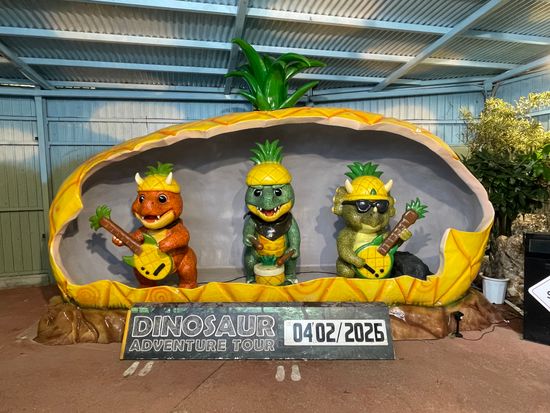 入り口でお出迎えするポップなキャラクターパイマルとパピコの巨大な人形も見ものです。園内では、自動運転のカート「パイナップル号」に乗り、パイン畑を巡る約10分のツアーにもご参加いただけます。