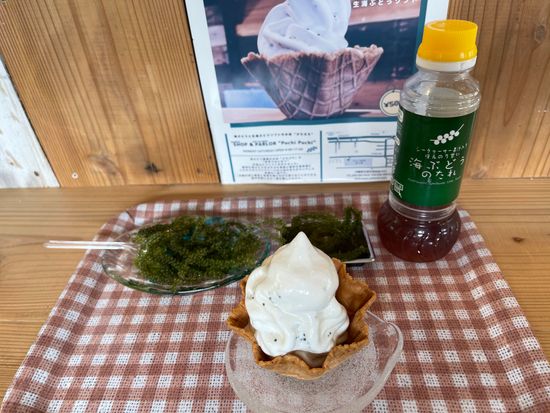 デザートには世界初の生海ぶどうソフトクリームを堪能いただきます。試行錯誤を続け、開発された海ぶどうの触感を残したソフトクリームです♪