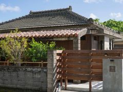 沖縄のモダン建築であるコンクリート造平家建て。BBQテラスのあるお部屋です。公民館や、伝統的な機織りの見学ができる芭蕉布会館がすぐそばにある集落の中心地にあります。