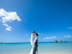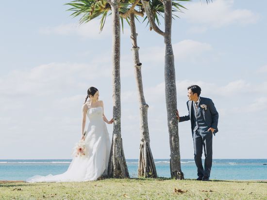 沖縄ならではの美しく青い海をバックに記念に残るウェディングフォト撮影をお楽しみください♪