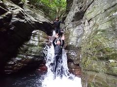 シャワークライミング(滝登り)をメインに楽しむ中級者向けアドベンチャーコース。瀬を越え、淵を渡り、流れ落ちる滝を自分の力で登る迫力体験が最大の見せ場です。天然スライダーや飛び込みも楽しめ、帰路はキャニオニングで爽快感抜群。1組貸切の完全プライベート制で、アクティブ派におすすめです。