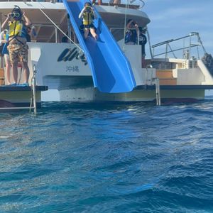 当日波が高くて慶良間まではいけませんでしたが、船に滑り台やジャンプ台、ブランコで遊べたので最高でした!!